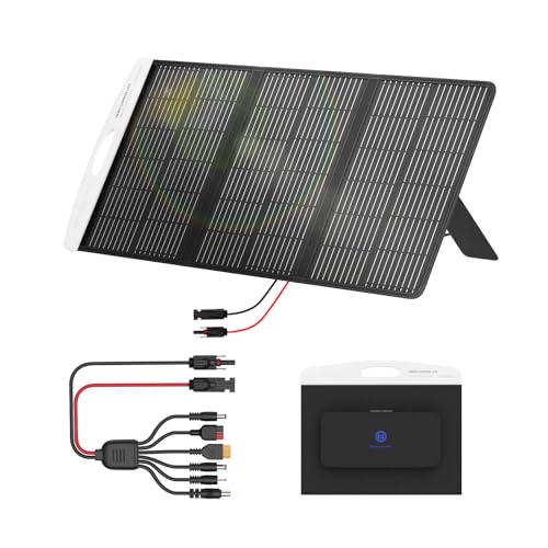 ERICSITYの100W折りたたみソーラーチャージャーは、最新型ETFE単結晶パネルを使用し、23%の高転換率を誇ります。IP65防水防塵、急速充電対応、スタンド付きでDC5521、DC7909、DC6530、DC35135、Anderson XT-60コネクタも完備。キャンプや防災に最適な軽量ポータブル電源充電器です。