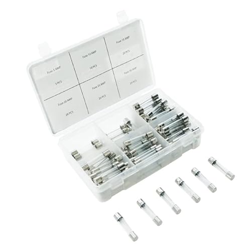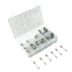 AGCガラス管ヒューズセット約95個入り、6サイズ(5A, 10A, 15A, 20A, 25A, 30A)で、250V対応。収納ケース付きで便利に保管できます。
