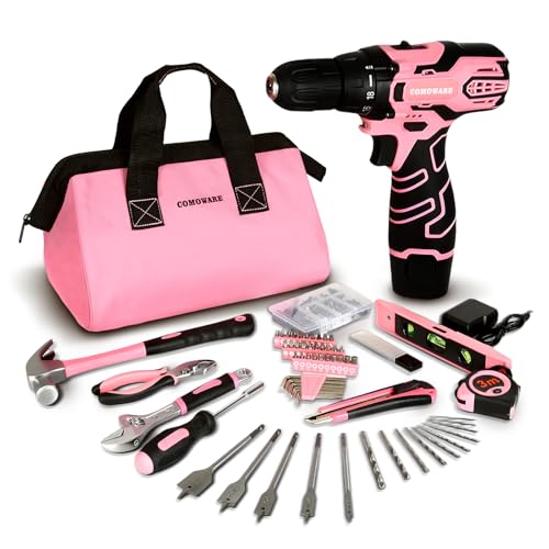 COMOWARE 12V ピンク コードレスドリルは、女性向けの自宅修理ツールキットで、電動ドリルと大容量の工具収納袋が付属しています。