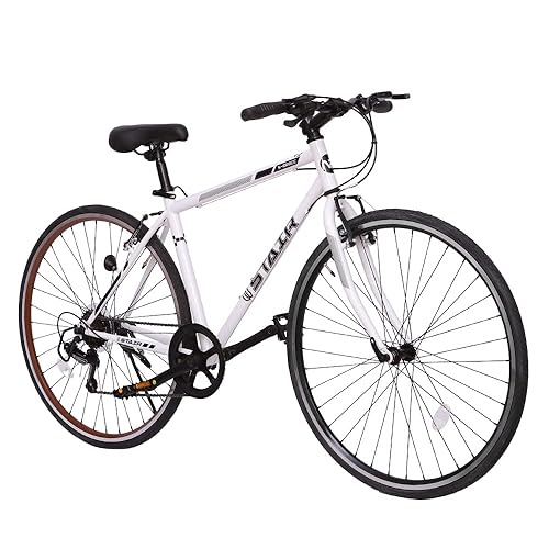 700x25cタイヤのクロスバイク。シマノ製6段変速、超軽量高炭素鋼フレームで初心者にも安心。フラットハンドル、前後Vブレーキ搭載。通勤や通学に最適なホワイトカラー。