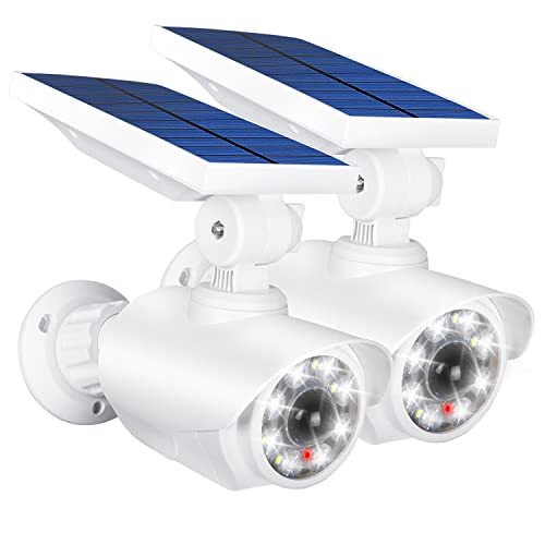 屋外用のソーラー人感センサーライト。防犯カメラ型で赤光威嚇機能付き。IP66防水・防塵で電源不要、太陽光充電で自動夜間点灯。8LED、800ルーメン、360°調整可能。2個セット。