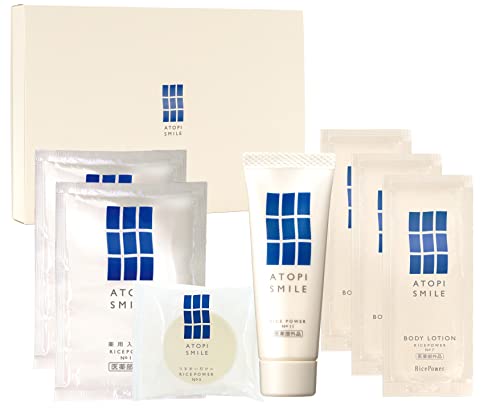 アトピスマイルの4アイテムセットは、皮膚トラブル対策に最適です。クリーム25g、ボディローション、入浴液、石鹸が含まれ、肌をやさしくケアします。トライアルキットでリピートしやすいです。ライスパワーを使用。