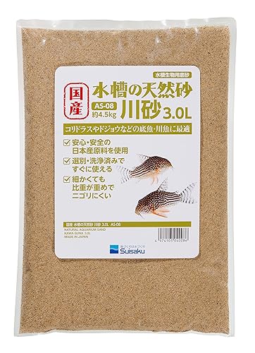 水作の国産川砂は、3.0リットルの容量で、細かい粒目設計によりニゴリにくく、水槽に最適です。天然素材を使用しており、アクアリウムに自然な美しさをもたらします。