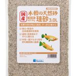 国産の天然硅砂、3.0リットル入り。中性から弱アルカリ性を好む観賞魚に最適で、優れた水質保持能力を提供します。水槽の底材として使用し、自然な美しい環境を演出。
