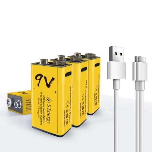 S Energy USB充電式9Vバッテリー、高容量リチウムポリマー9V 650mAhバッテリー、1.5H高速充電、1200サイクルタイプCポートケーブル付き、常時出力4個パックの高価買取