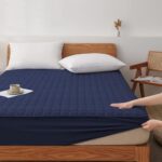 パッド一体型ボックスシーツ、シングルサイズ(100x200x30cm)。充填物グレードアップで、オールシーズン快適。防ダニ、抗菌防臭、吸汗速乾、ゴムバンド付きで洗えるホテル仕様。ネイビー色。
