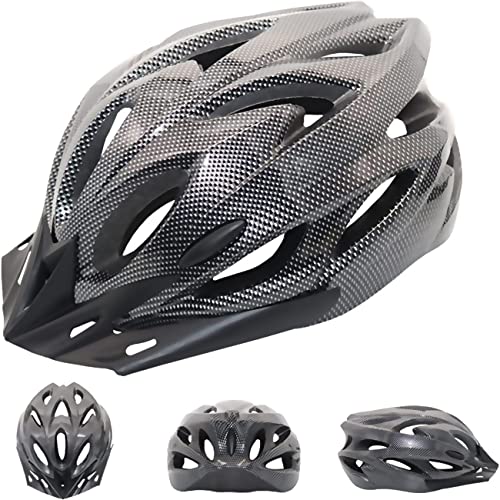 大人用自転車ヘルメット。耐衝撃性、高通気性、超軽量設計。サンバイザー付き、18通気ホール、サイズ調整可能。アゴパッド付きで男女兼用。色はカーボンブラック。