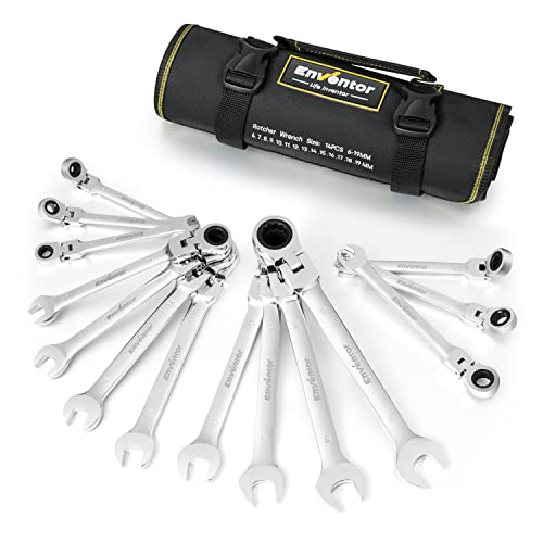 エンベントのラチェットレンチセットは、角度調整可能で6~19mmのサイズが揃った14本組。首振り機能付きの両用ヘッドで、専用ポケットと収納ポーチが付属します。