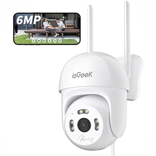 ieGeekモデルの600万画素防犯カメラ。360°自動追尾、24時間録画、H.265圧縮、メモリカード・クラウド対応。人体検知・モーション通知、2.4G wifi、Alexa対応。防水/IP66、駐車場・玄関に最適。