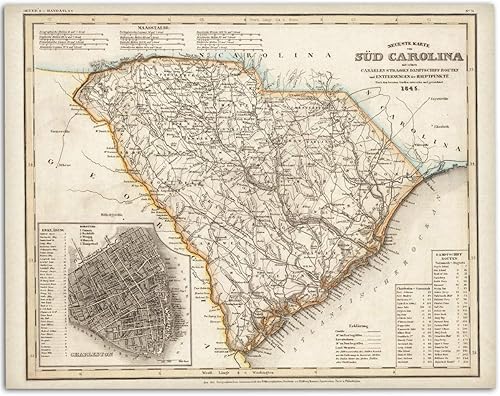 1845年のサウスカロライナ地図は、州の地理と主要都市、河川、交通路を示しています。詳細な境界線と地形が描かれ、歴史的な視点から地域の発展を理解するのに役立ちます。