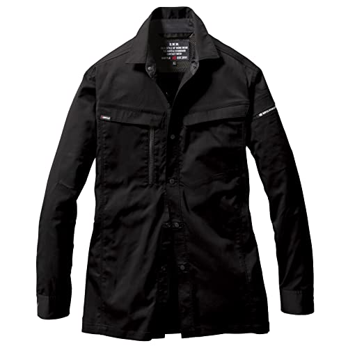 バートルの長袖シャツ6215は、ユニセックスでストレッチ性に優れ、春夏向けの薄地作業服です。リサイクル素材を使用し、SDGsに対応。帯電防止機能もあり、ストラップ付き。色は35-ブラックの3Lサイズ。
