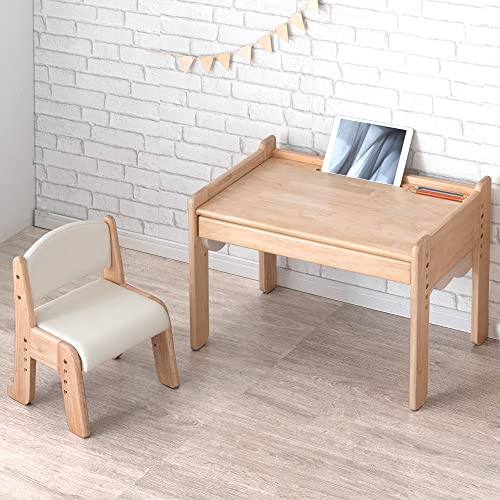 タンスのゲンのキッズデスクチェアセット。高さ調整可能な1人掛け、木製でナチュラルとアイボリーの色合い。現役ママのアイデアでデザインされた安全で使いやすいアイテム。