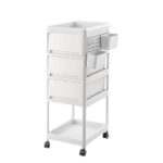 収納カートはキャスター付きで移動便利、3色展開(ホワイト含む)。2/3/4段から選べて、ベビー用品やオムツの収納に最適。引き出しやフック付きで小物整理も簡単。おしゃれなデザインでキッチンにもぴったり。