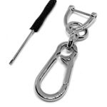 シャックルキーホルダーは、シルバーのカラビナタイプで、スマートキーやホースシュー(馬蹄)デザイン。車やベルトループ、カバンの持ち手にも対応。ドライバー付きでシンプルなデザインが特徴です。