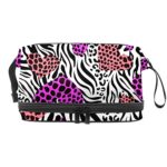 ユニセックストイレタリーバッグは、ハンドル付きで便利。シマウマやヒョウのアニマルプリントが特徴的で、化粧品やブラシなどを収納可能なモダンなデザインです。