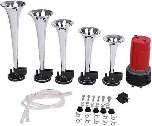 ラッパ ホーン 5連 ミュージックエアホーンは12V対応の車やバイク用。ヤンキーホーン音源を持ち、メッキシルバー仕上げでスタイリッシュなデザイン。音量も大きく、目立つサウンドで注目を集めます。
