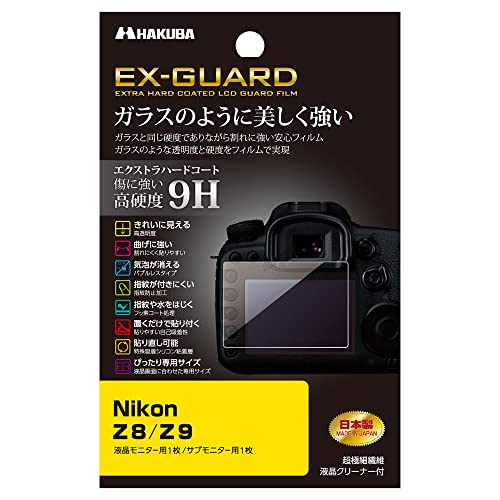 ハクバのEX-GUARD液晶保護フィルムは、Nikon Z8/Z9専用で、高硬度9Hのガラスのような透明度と強度を実現。傷防止効果があり、日本製です。