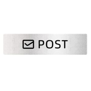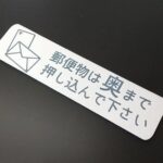 アクリル製の郵便ポスト用プレート。サイズは2.5cm×10cm、ホワイトのベースにブルーの文字で「郵便物は奥まで押し込んで下さい」とシンプルに記載。横向きのデザインでおしゃれな印象を与えます。