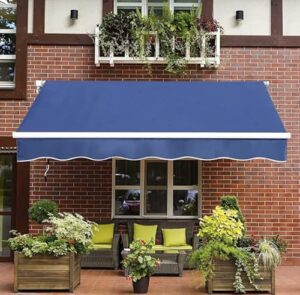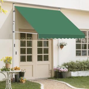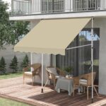 オーニングテントはつっぱり式の日よけスクリーンで、巻き取り式。角度と高さ調節が可能で、サンシェードとしても利用可。簡単に設置でき、日除けや雨よけ効果を持ち、UVカット機能もあり。コンパクトサイズ(幅2.5m、ホワイトポール・ベージュ布)。