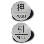 Seagronの押す引くドアプレートは、シルバー色の2㎜アクリル製でおしゃれな丸型デザイン。両面テープ付きで簡単に取り付け可能。