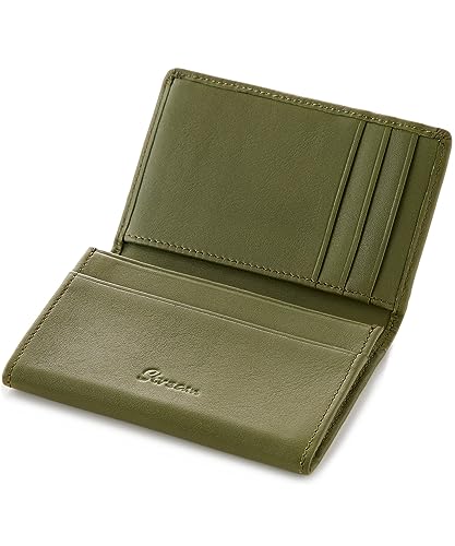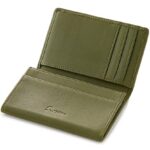 名刺入れは、本革ナッパレザー製で、柔らかく傷がつきにくい特性があります。大容量で最大50枚収納可能。スタイリッシュなカーキ色でメンズに最適なアイテムです。