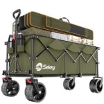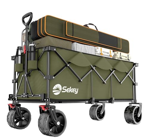 Sekeyキャリーワゴンは特大容量300L、高耐荷重200kgで、荷室の長さ113cm。幅10cmのブレーキ付き極太ノーパンクタイヤ採用。自立収納可能で、アウトドアや運動会に最適なワゴンです。