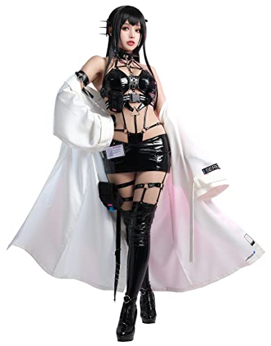 Miccostumesのレディースコスプレ衣装。セクシーでかわいい小悪魔や魔女のデザイン。ストラップ風ブラとミニスカートの上下セット。悪魔のコスチュームに最適。サイズ:S、色:ブラック系。