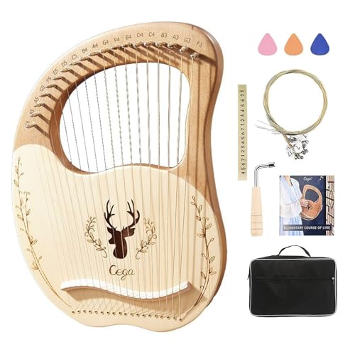 19弦の木製竪琴ハープ。初心者向けでコンパクトなデザイン。メタル弦で心癒しの音色を提供。マホガニー製で操作簡単、チューニングレンチと収納袋付き。大人や子供に最適。