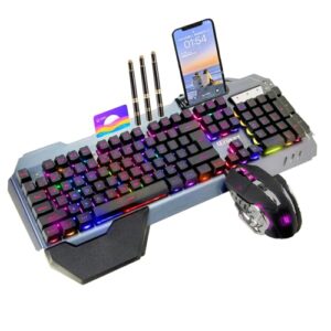 RGBバックライト付きゲーミングキーボードとマウスセット – 16種類の照明モード、2400DPI 4ボタン光学マウス、マウスパッド、携帯電話ホルダー – 人間工学に基づいた手首サポート – ブラック