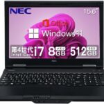 NEC VersaProハイスペックノートパソコン。第4世代Core i7、8GBメモリ、512GB SSD搭載。16型、Win 11、Office 2019、テンキー、無線Wi-Fi、USB 3.0、HDMI、DVDドライブ付。整備済品。