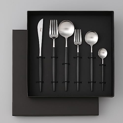 Cutipol(クチポール)のGOAブラックシルバーカトラリーセット6pcs。初心者向けのおしゃれな結婚式用ギフト。食器洗い機対応で、キッチンにぴったりのプレゼント。
