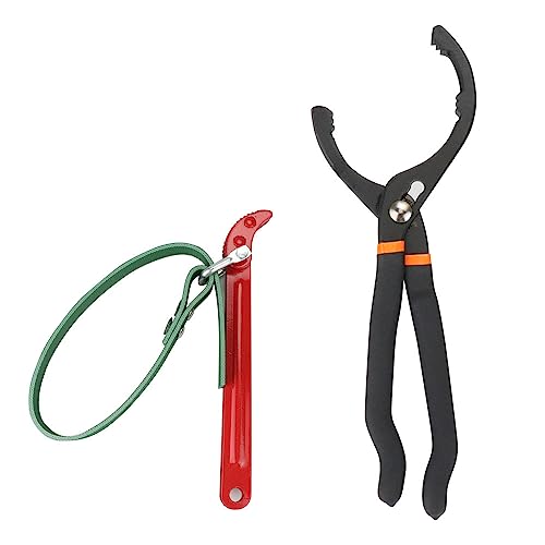 プライヤー式レンチとベルトレンチの2種セット。オイルフィルターの交換やメンテナンスに最適。サイズは5.5-12cm対応の開栓工具。頑丈な作りで使いやすい。