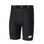 ニューバランスのサッカー用ショーツ、ストレッチインナーパンツ JMPF7382。カラーはブラック、サイズはL。快適なフィット感で、プレイ中の動きをサポートします。