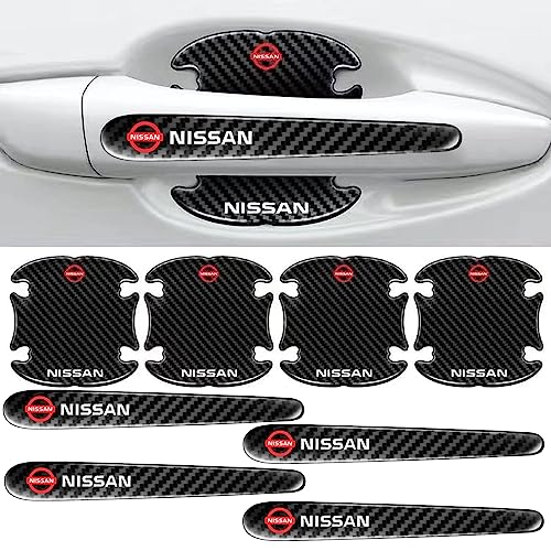 車用ドアハンドルプロテクター4枚と保護シート4枚のセット。ブラックの無地またはカーボン調で、キズ防止や隠しに最適。簡単に取り付け可能な外装アクセサリー。対応車種: Nissan。