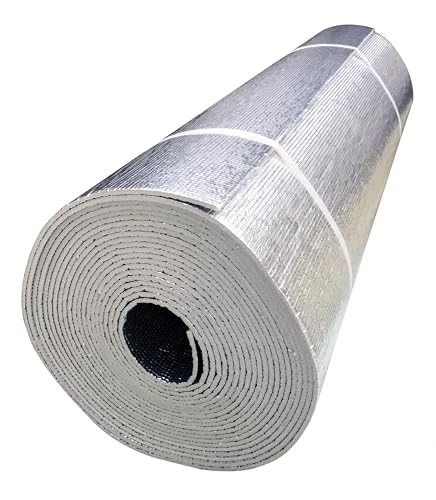 業務用両面アルミ加工のアルミ遮熱シートサイズは1m×12mです。高い遮熱性を持ち、冷暖房効率をアップ。断熱材や遮光材としても最適です。