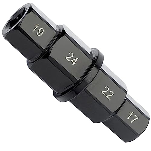 六角アクスルモーターサイクルツールは、17mm、19mm、22mm、24mmのソケットが付属し、フロントアクスルの分解に最適。バイク用の耐久性あるブラック仕上げで、扱いやすい設計。