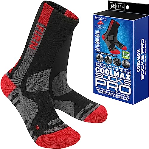 フィルン クールマックス ソックスは、ハイキングやトレッキングに最適な高機能靴下。通気性、吸水速乾性に優れ、軽量で中厚手。クッション性があり、水ぶくれ防止。男女兼用、クルー丈で快適な履き心地。サイズL、色はレッド。