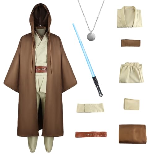 大人用ハロウィンコスプレ、「ジェダイコスチューム」8点セット。茶色と黒のマント、ライトセーバー、ネックレス付き。5サイズ展開で、文化祭やイベントに最適。