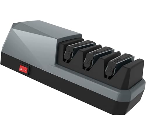 Udoricの電動包丁研ぎ器は、3段階の研磨を提供し、片刃・両刃・波刃対応。超高硬度で耐久性に優れ、刃の厚さ3mm以内のナイフに最適。取扱説明書付きで使いやすい。