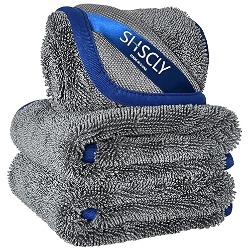 SHSCLYのマイクロファイバー洗車タオルは、超吸水で厚手のコンパクトサイズ(30x40cm)を持ち、絞りながら使用可能。グレーに青縁のデザインで、3枚入りです。