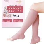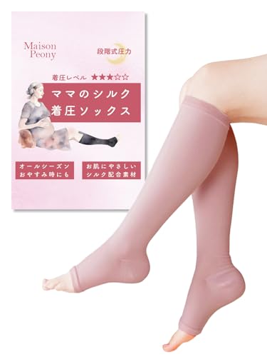 メゾンピオニーの着圧ソックスは、妊婦や産後の方に最適なシルク混で、寝る時用のひざ下タイプ。フリーサイズで、日本製のダスティローズ色のデザインです。