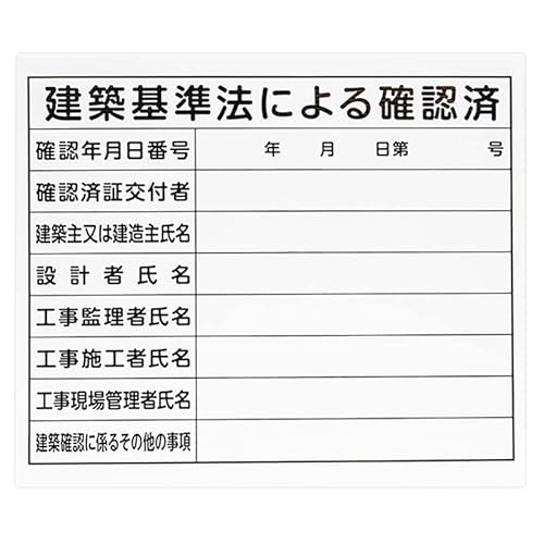 シンワ測定の法令許可票「建築基準法による確認済」は、耐久性に優れたプラダン製で、サイズは31×37cm、横型デザイン。施工現場での法律遵守を効果的に示すアイテムです。