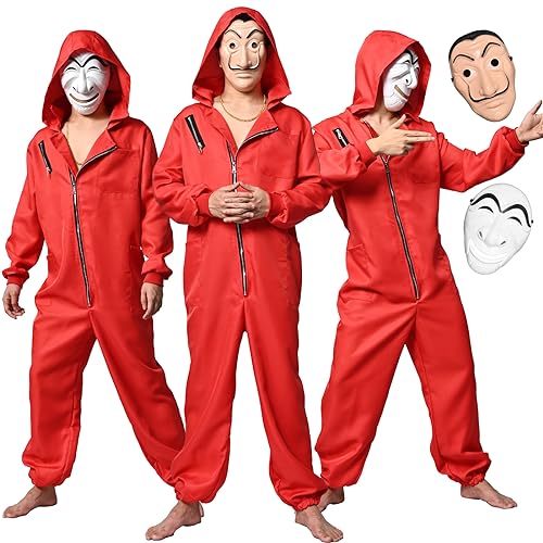 【Formemory】ハロウィン用コスプレ3点セット。赤い連体服、マスク2点、つなぎ服1つ。スペインドラマのピエロスタイル。サイズXXL。仮装、パーティ、文化祭に最適。