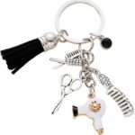 tenghong2021のキュートな美容師用キーチェーン。櫛、はさみ、ヘアドライヤー、タッセル付きのブラックダイヤモンドチャームが特徴。ホワイトで小さなサイズ、ヘアスタイリスト向けの特別なギフトに最適です。