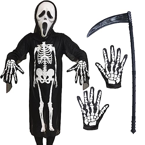 ハロウィンコスプレ用の骸骨仮装セット。骸骨マント、骨柄手袋、スクリームマスク、武器模型(斧/大鎌/風船ナイフ)付き。大人・子供兼用、定番の怖い雰囲気づくりに最適です。