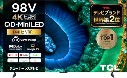 TCL 98V型 4Kテレビは、2023年モデルで高解像度の映像を提供。AI技術搭載で映像処理が向上し、広視野角と豊かな色彩を実現。スマート機能も充実!