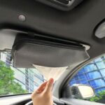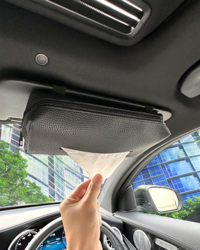 薄型で蓋なしの車用ティッシュホルダーです。サンバイザーやヘッドレストに取り付け可能で、便利にティッシュを収納できます。色はブラックで、車内のスタイルにマッチします。