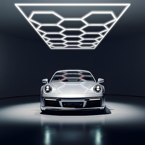 六角形ガレージライトは、430W、51600LMの高輝度を誇るDIYセットで14個のライトが含まれ、洗車室やショールームに最適。6500Kの明るい光で、PCプラスチック製(485*244cm)です。