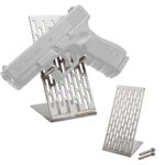 良品武品のステンレス製ハンドガンディスプレイスタンドは、メッシュタイプで無骨なデザインが特徴です。世田谷ベース風のガンラックとして、シルバーの仕上げでおしゃれにディスプレイできます。