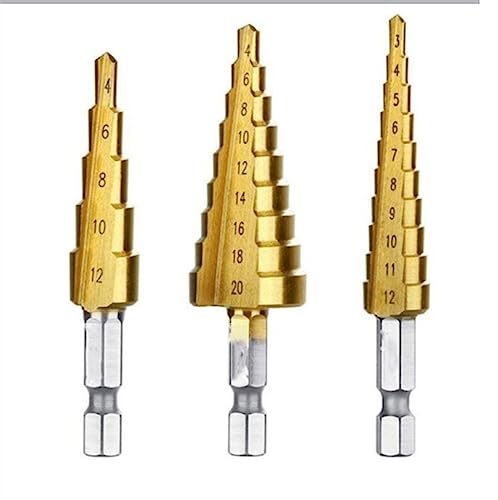 XiBanyのステップドリルビットセット(3点)で、サイズは3-12mm、4-12mm、4-20mm。メッキコーティングされたストレート溝で、木材用ホールカッター。